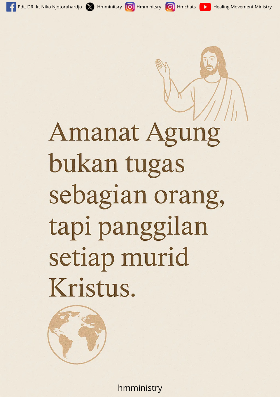 Kiranya renungan ini menolong kita melihat bahwa keluarga tidak pernah menjadi tujuan akhir, melainkan bagian dari karya Allah yang lebih besar. Allah adalah pencipta keluarga, dosa memang merusaknya, tetapi Kristus telah menebus dan memulihkannya. Melalui keluarga-keluarga yang ditebus—meski tidak ideal—Allah terus mengerjakan misi keselamatan-Nya di dunia: menuntaskan amanat agung!!!